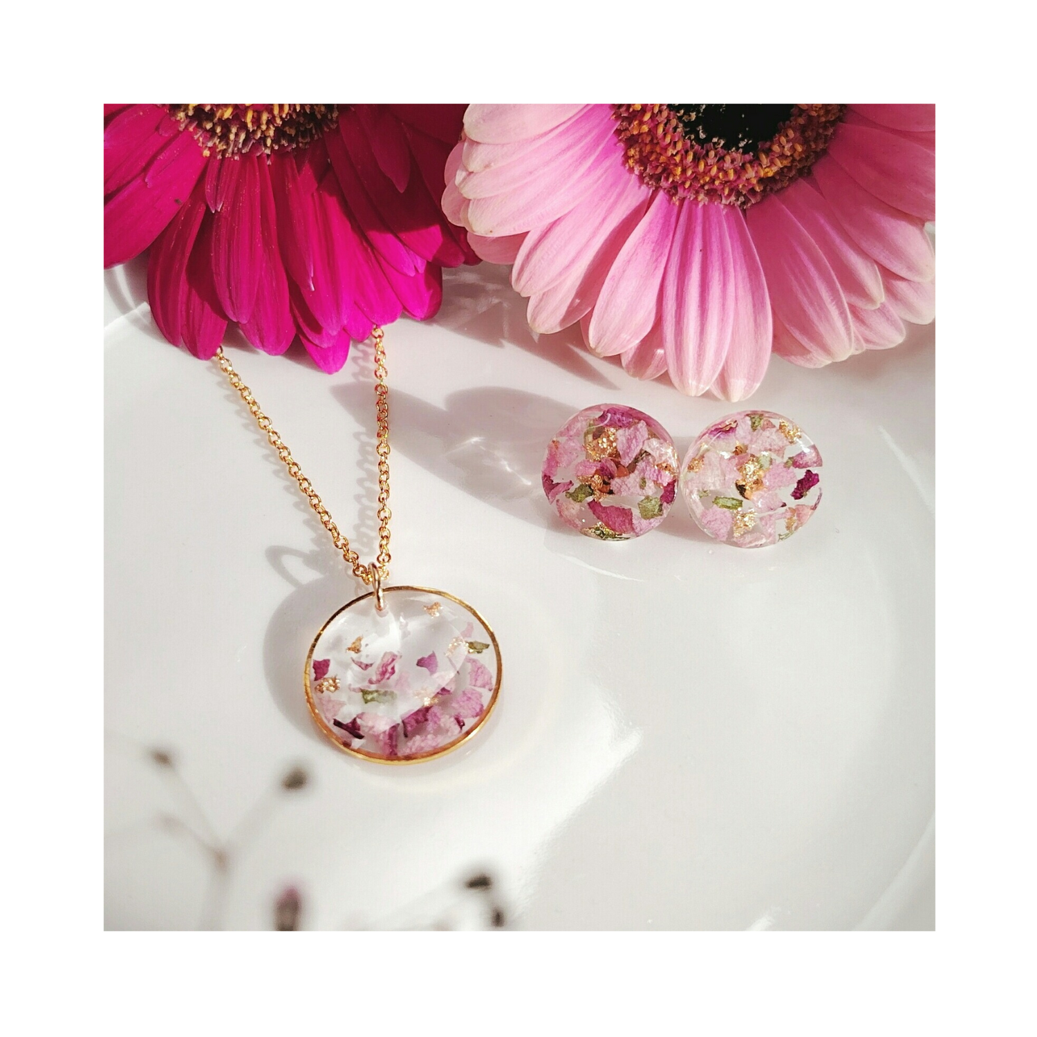 - Kukat murskataan ja asetellaan kauniisti koruihin, mukaan ripaus lehtikultaa