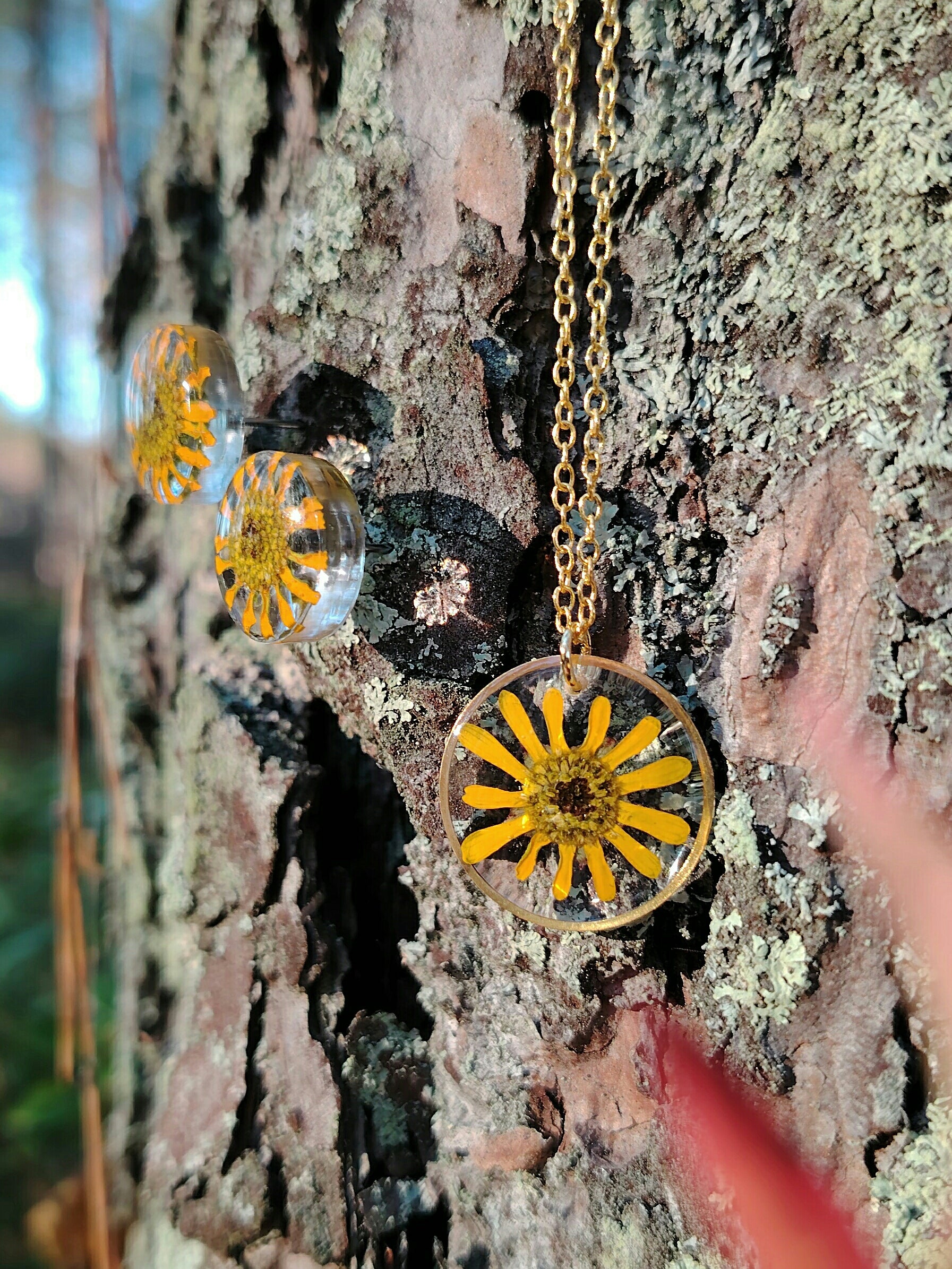Setti sisältää suloiset Huovinkukkanapit ja riipuksen. Riipuksessa on 18K kullatut teräksiset korunosat ja nappikorvakoruissa kirurginteräksiset tapit. Kaikki metalliosat ovat nikkelittömiä, lyijyttömiä ja kadmiumvapaita.