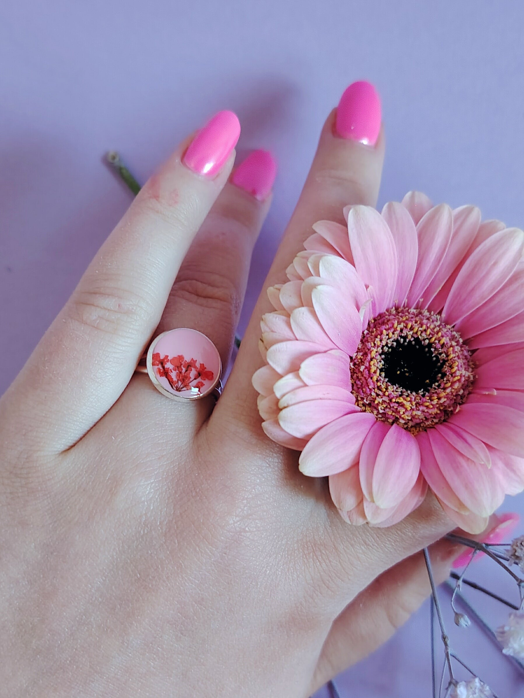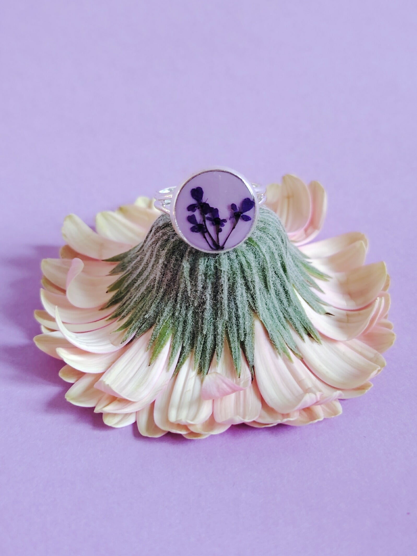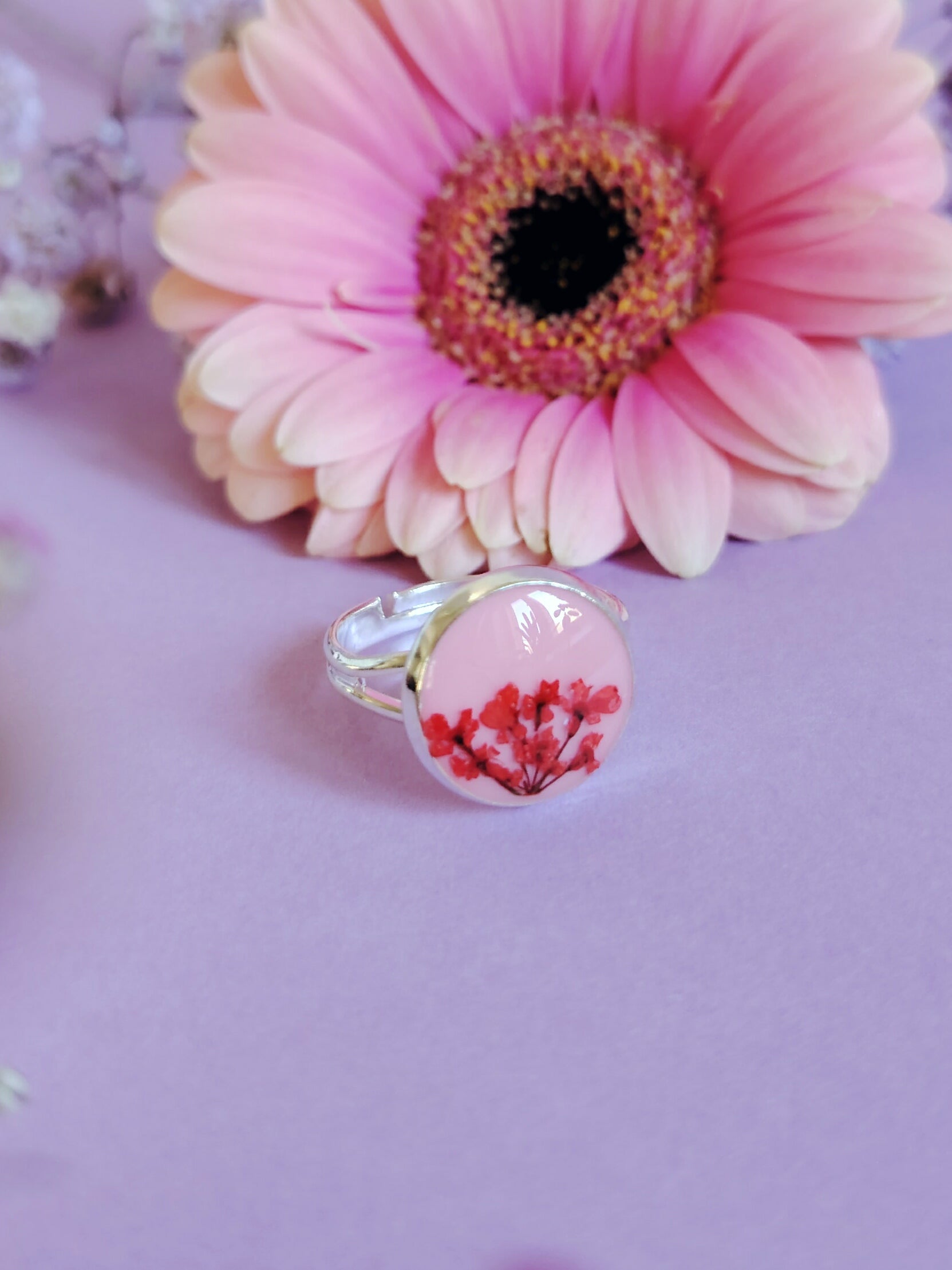 Tässä aivan erityisessä sormuksessa on käsinmaalattu koiranputken kukka ihanan pirteää taustaa vasten. Upea väripilkku joka piristää asun kuin asun! Sormus on säädettävää mallia, ja pienimmillään se on n. 17mm