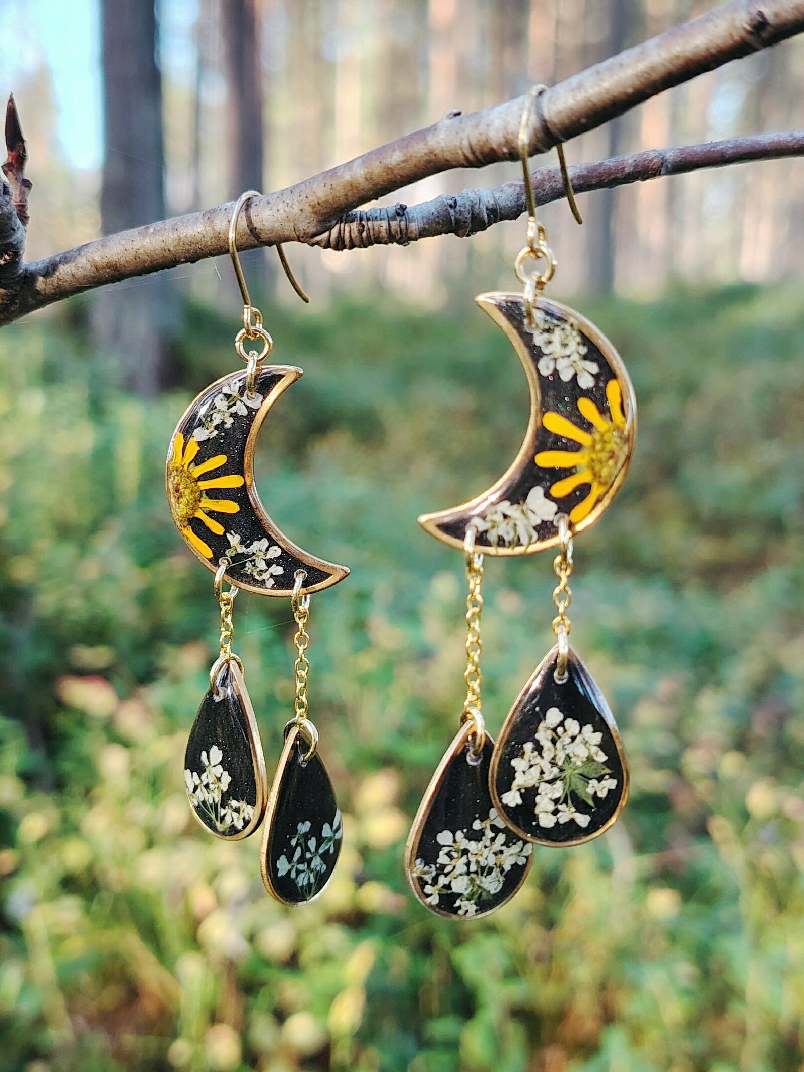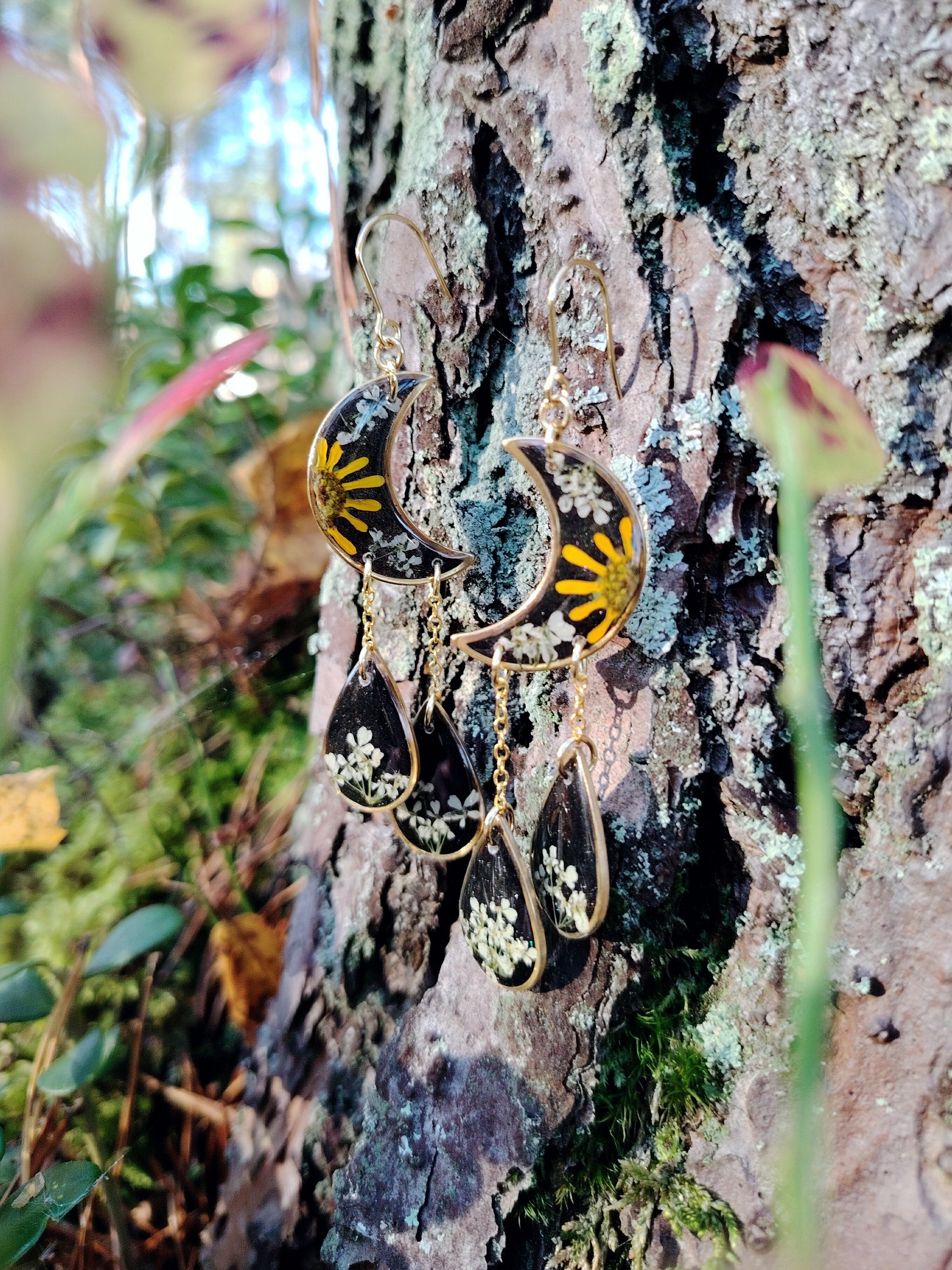 Nämä ovat täydelliset korut sellaiselle, jolle syksy eli spooky season on lempivuodenaika. Näissä mustissa kuissa on kaunis keltainen Huovinkukka ja somisteena valkoisia koiranputken kukkia. Kuusta riippuu kaksi "kyyneltä", jotka on kiinnitetty sirolla kultaketjulla.