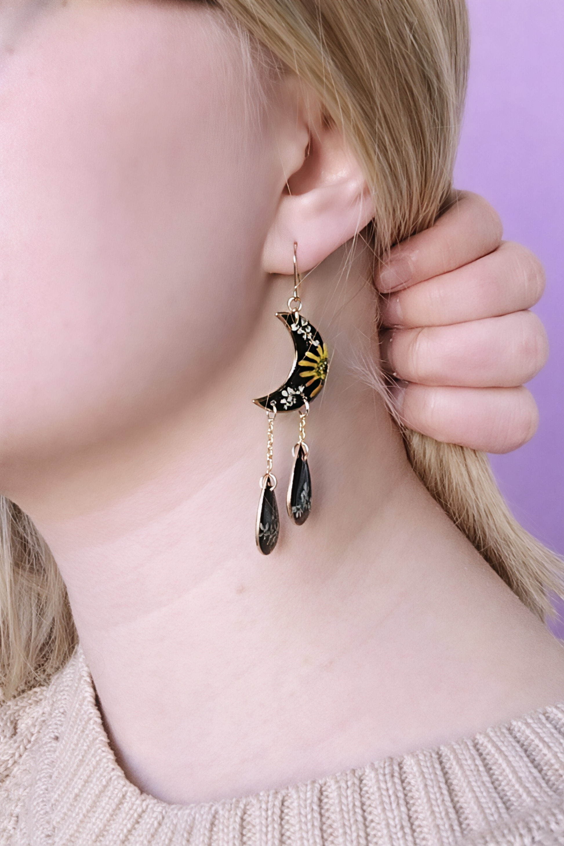 đ» TĂ€ydelliset korvakorut vĂ€hĂ€n tummemmista ja sĂ€rmikkÀÀmmistĂ€ koruista pitĂ€vĂ€lle. NĂ€issĂ€ mustissa kuissa on kaunis keltainen Huovinkukka ja somisteena valkoisia koiranputken kukintoja. Kuusta riippuu kaksi "kyyneltĂ€", jotka on kiinnitetty sirolla kultaketjulla.