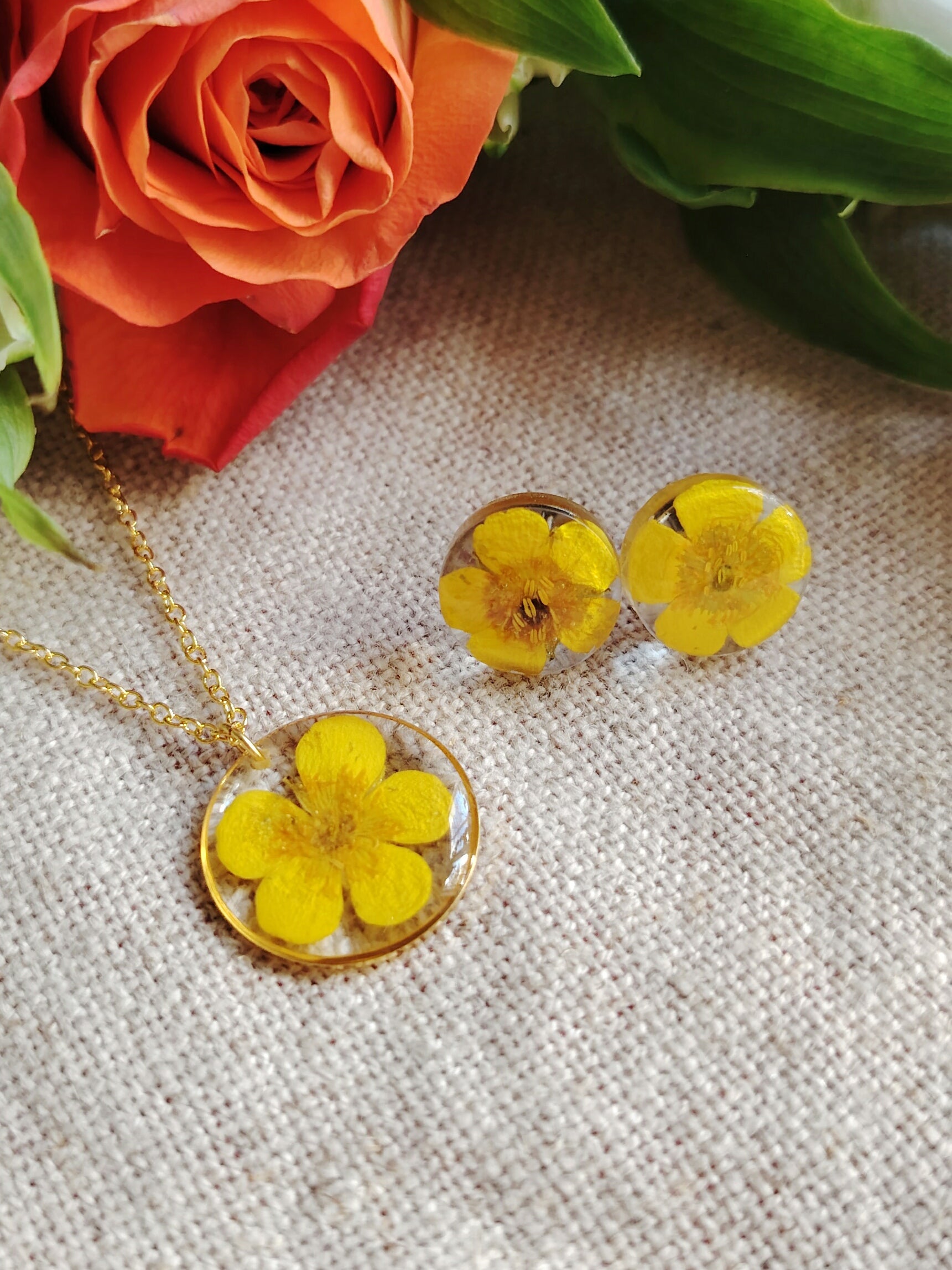 Setti sisältää suloiset niittyleinikkinapit ja riipuksen. Riipuksessa on 18K kullatut teräksiset korunosat ja nappikorvakoruissa kirurginteräksiset tapit. Kaikki metalliosat ovat nikkelittömiä, lyijyttömiä ja kadmiumvapaita.
