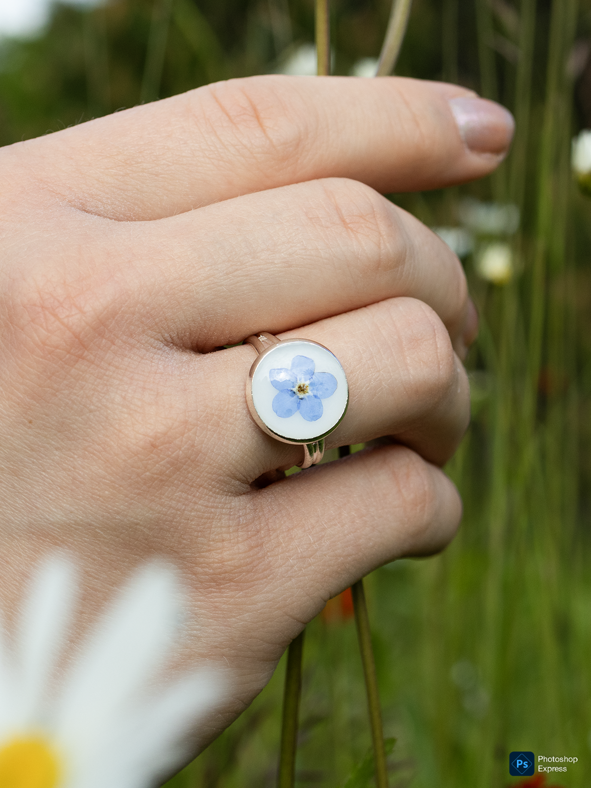 🌼 Söpö sormus, jossa on sisällä valkoista taustaa vasten vaalean sininen lemmikin kukka. Kukka on poimittu Pohjois-Suomesta Oulujoen varrelta kesällä 2025.