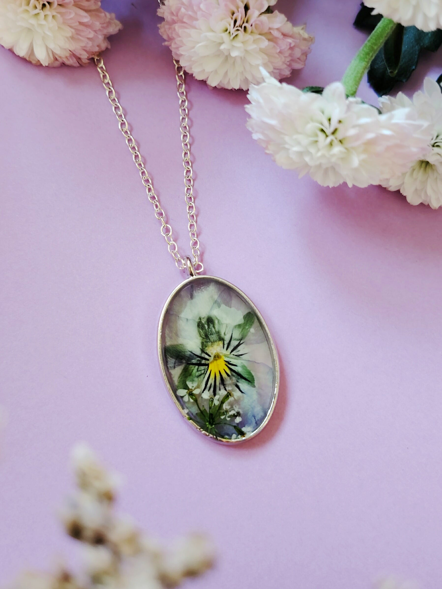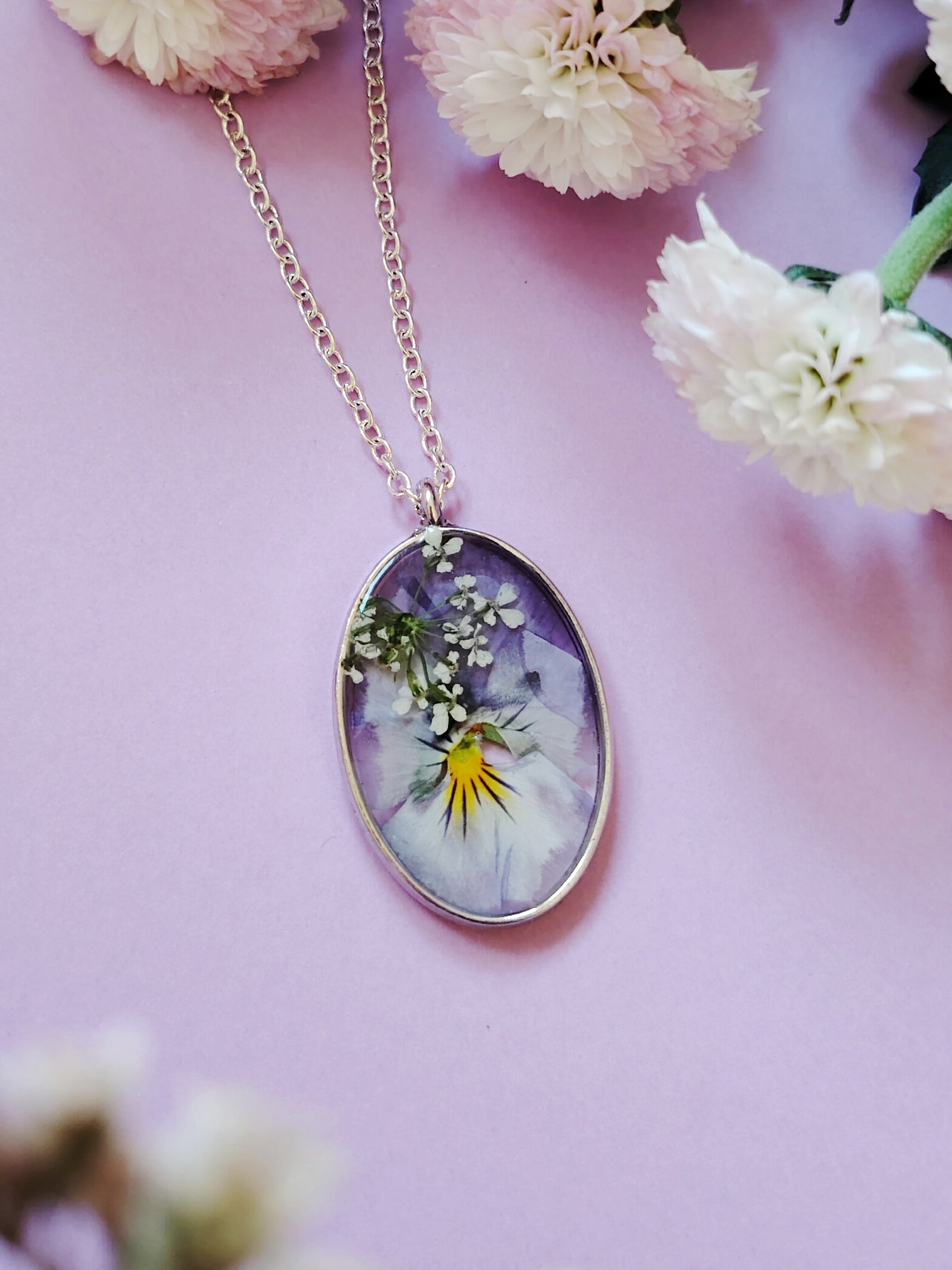 Upea orvokkiriipus hopean värisessä riipuskehyksessä. Somisteena valkoista koiranputkea. Kehyksen halkaisija pystysuunnassa 32mm (ilman ripustuslenkkiä). Ketjun materiaali on nikkelivapaata korumetallia, pituus n. 50cm. Ketju on väriltään kirkkaan hopeinen.