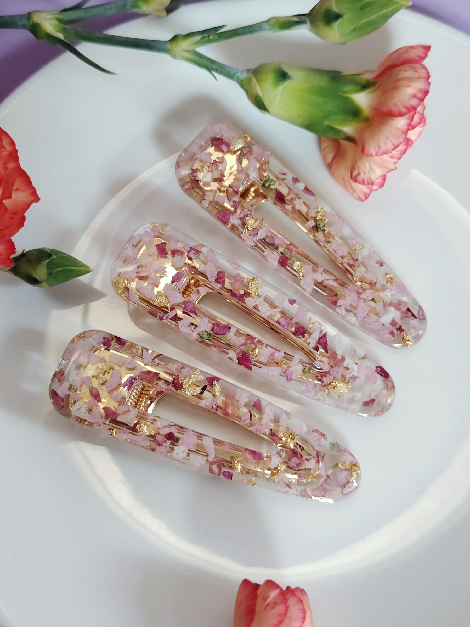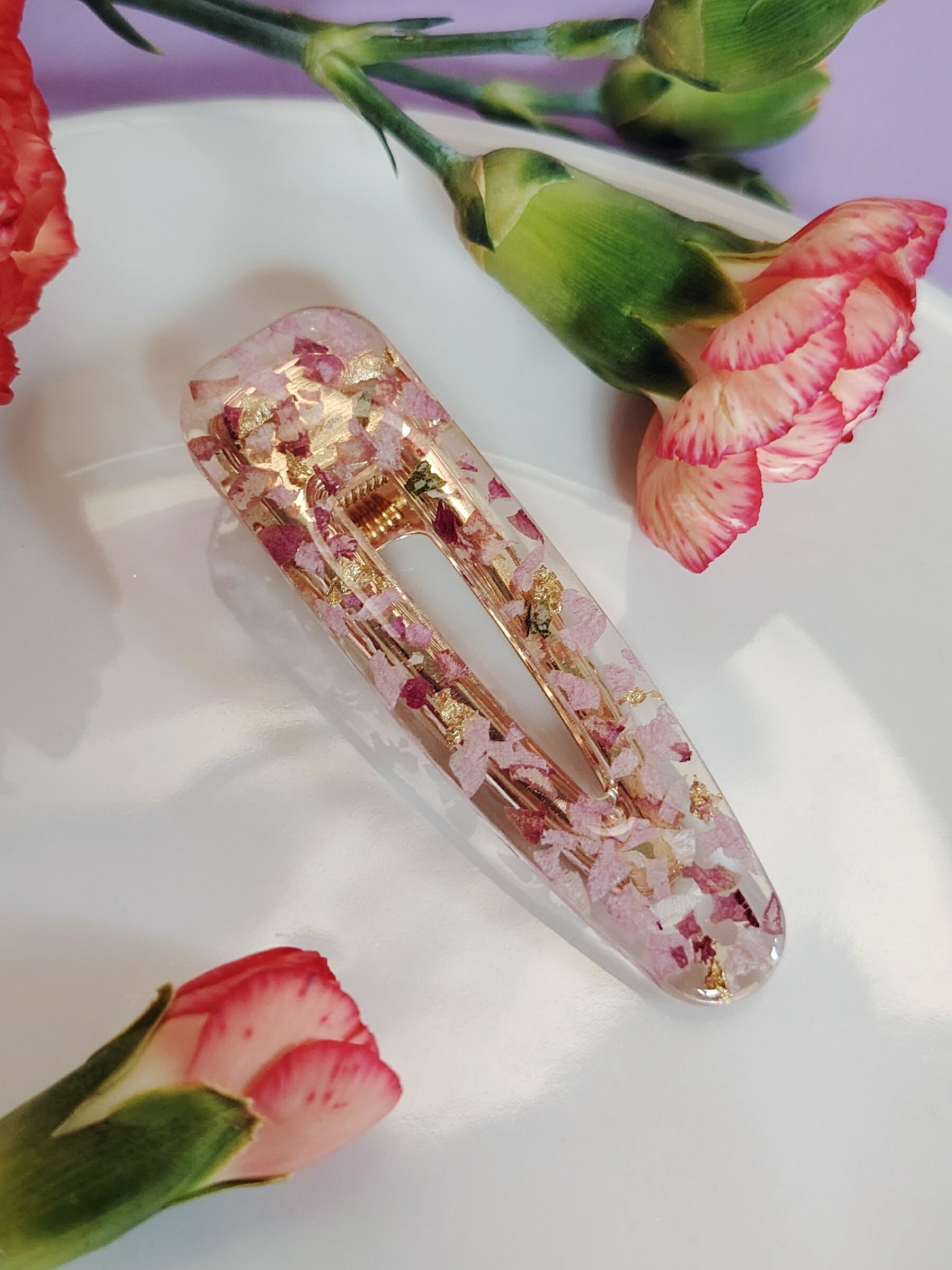Pinni, jonka sisällä on murskattua ruusua ja pieniä lehtikultahippuja. Pinni on kolmion muotoinen ja pituudeltaan n. 7cm. Klipsi on jämäkkä ja pysyy napakasti myös ohuemmissa hiuksissa. Klipsi on on kiinnitetty suoraan hartsiin valamalla, joten pinni ei sisällä mitään ylimääräisiä liimoja.
