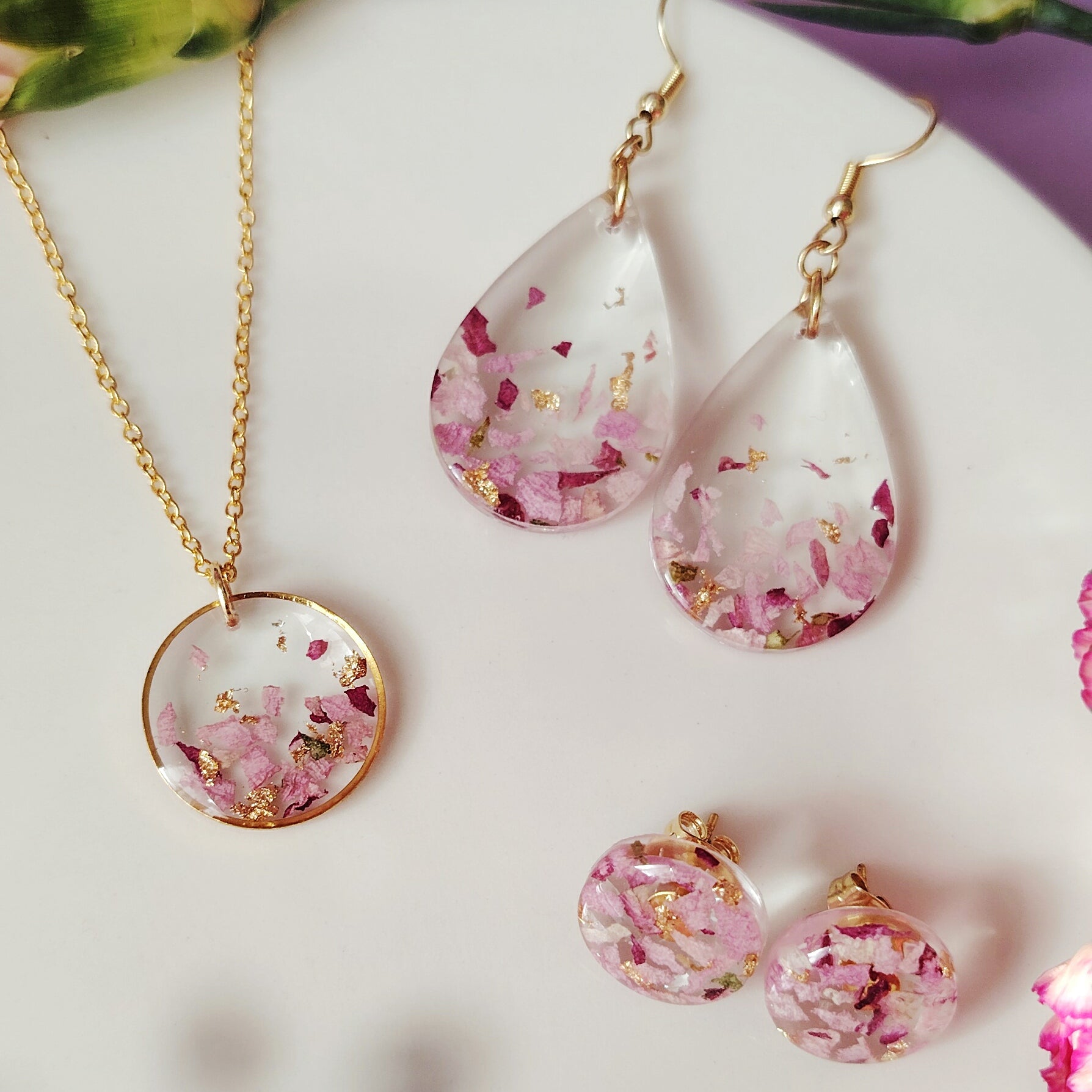 🌹Näissä klassisen kauniissa korvakoruissa on sisällä murskattuja ruusun terälehtiä ja pieniä lehtikultahippuja.