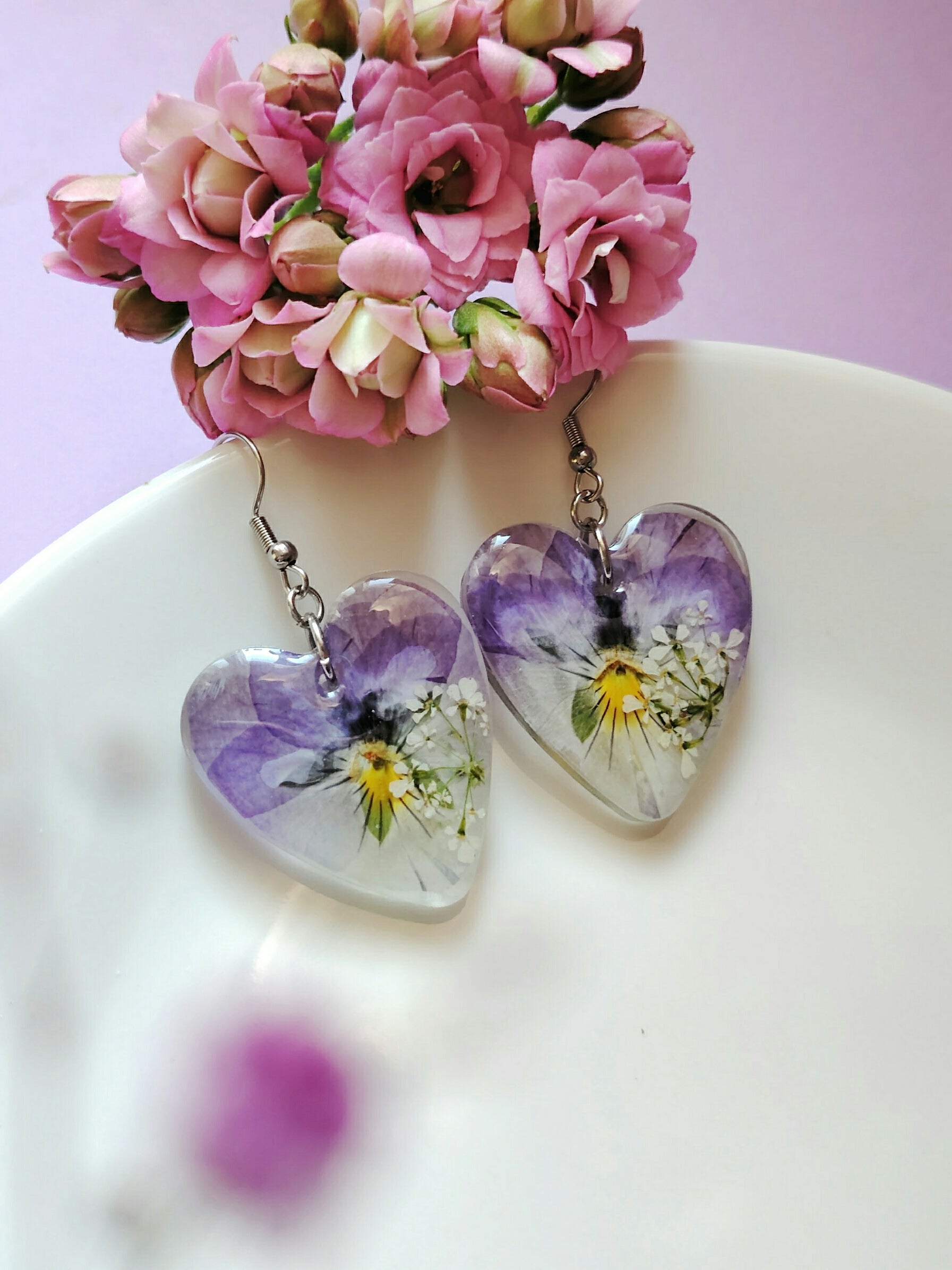 Näyttävät korvakorut, joissa on sisällä oikea orvokki ja somisteena koiranputken kukkaa. Sydämen koko pituussuunnassa n.3cm. Koukut ovat kirurginterästä, joka on testatusti nikkelitöntä.